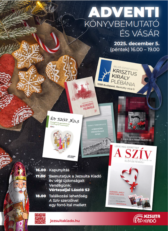 2025. december 5-én délután 16.00-tól immár hagyományosan adventi könyvbemutatót és vásárt rendez a Jezsuita Kiadó a Belső-Józsefvárosi Krisztus Király Plébánián. Vendégünk lesz kiadónk könyvbizottságának, illetve A Szív szerkesztőbizottságának jeles tagja, Vértesaljai László SJ. Mindenkit szeretettel – és természetesen nagy kedvezményekkel, valamint téli finomságokkal – várunk!