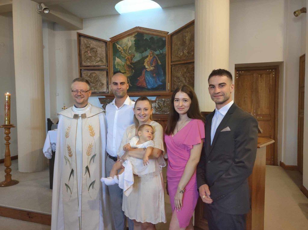 Keresztelő a miskolci Isteni Ige-templom kápolnájában, bal szélen Koronkai Zoltán SJ
