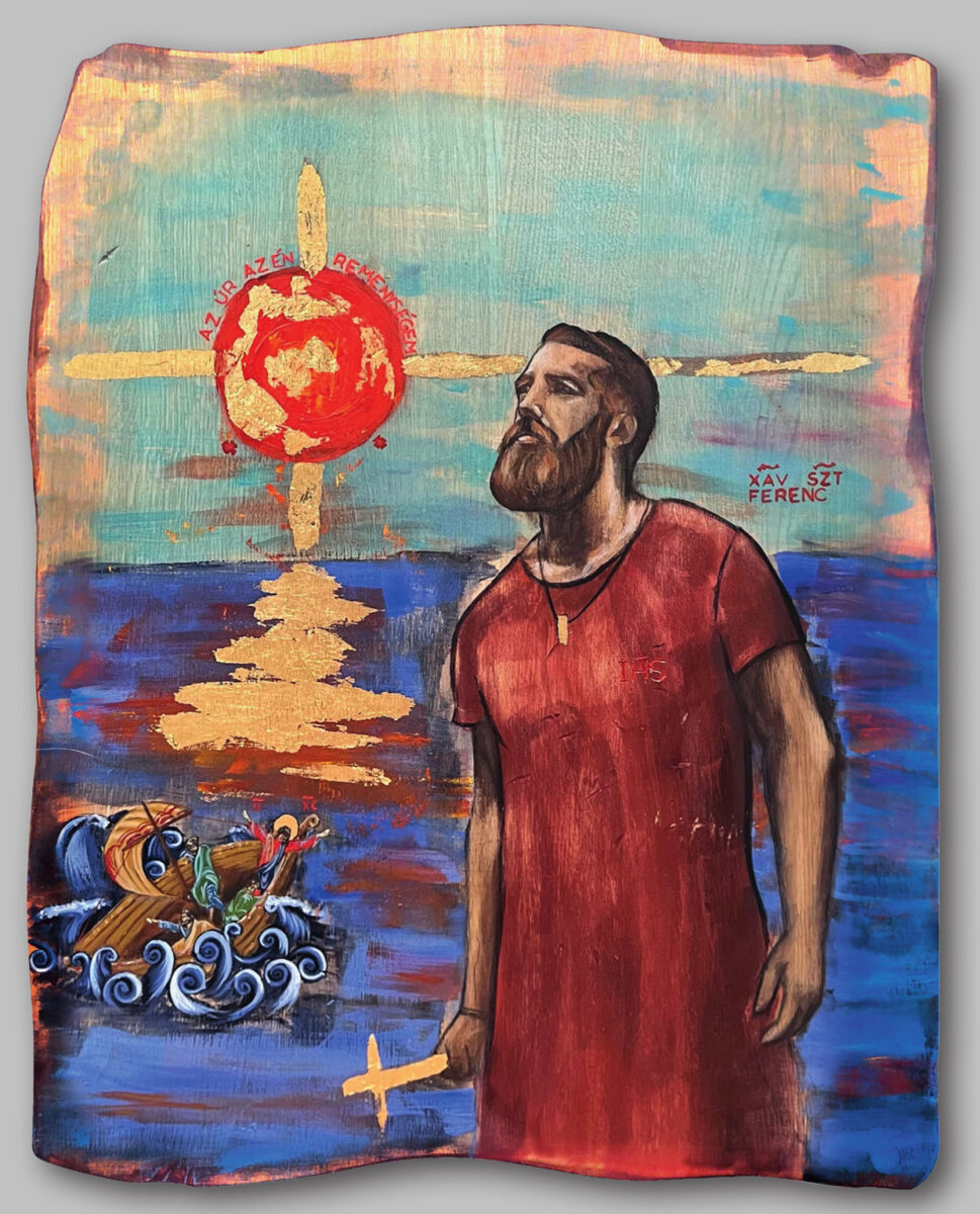 – Az előkészület időszaka valóságos ajándék volt számomra. Az igazság az, hogy leginkább az ő hatására kértem a felvételemet a jezsuita rendbe, és ezt az ikont valójában elég régóta hordozom magamban. Hálás vagyok, hogy végre alkalmam adódott, hogy meg is valósítsam. Xavériban a lelkesedése és a lendülete vonz, ahogyan vágyik rá, hogy teljesen idegen vidékeken és kultúrákban hirdesse az evangéliumot. Isten valóságos kalandora volt, aki rajongott a legkülönfélébb emberekkel való találkozásokért. Ugyanakkor csodálattal tölt el, hogyan őrizte meg a szívében azt az őszinte szeretetet, amelyet az első társak iránt érzett. Ezt az érzelmekkel teli Ferencet akartam megjeleníteni, aki képes Isten horizontját a szeme előtt tartani, s így az élet minden viharát kiállja. Egy kortárs ember arcát és alakját kölcsönöztem neki, hogy képes legyen megszólítani a ma emberét. Olyan anyagokat és színeket választottam, amik őt fejezik ki: az életet, a tüzet, az Isten kalandjára mondott igenjét, és azt, hogy az élet viharain átvezet a Belé vetett bizalom. Ránk ugyan már nem várnak olyan missziók, mint Xavéri Ferencre, de annál inkább vágyakozhatunk arra, hogy megéljük missziós lelkesedését és bátorságát, amelyek számára nem jelent akadályt sem országhatár, sem előítélet, sem az idegen nyelv vagy kultúra. Arra is alkalmas lehet egy műalkotás, hogy szakítsunk azokkal az elvárásokkal, amelyekkel a szemlélő egy adott témához közelít. Bárcsak aki rátekint a Xavérimre, azt érezné, hogy kérdezni akar tőle valamit…